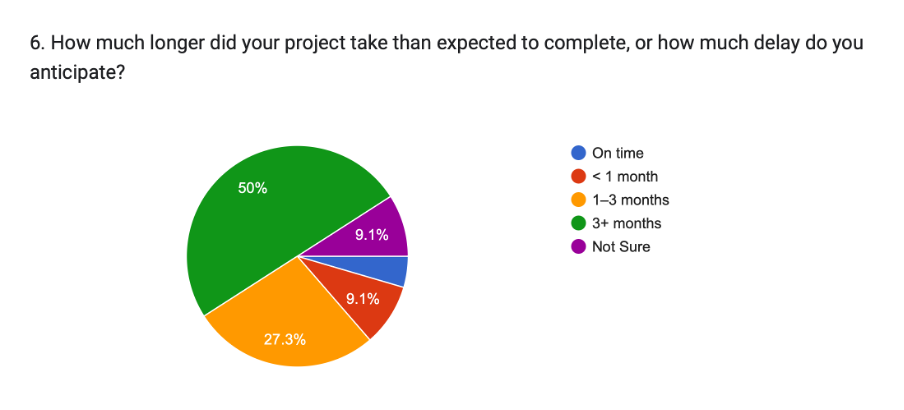 Time and cost inefficiencies remain a major concern. Over 50% of projects experienced delays exceeding three months, with an additional 40% extending beyond expected delivery timelines. Budget overruns were also common, with 46% of projects exceeding costs by 25–50%. In parallel, many respondents reported spending an additional 10–20+ hours per week managing projects, highlighting the absence of streamlined project management support.