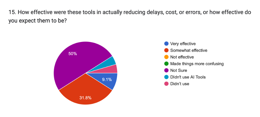 When assessing AI adoption, 77% of respondents indicated they have used AI tools, primarily for design ideation, cost estimation, and comparing options. However, effectiveness remains mixed. Only a small proportion found these tools highly effective, with most describing them as only somewhat helpful. Key limitations include a lack of real-time accuracy, poor integration with construction workflows, and limited trust in outputs.